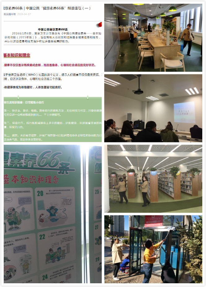 今年4月是第31个爱国卫生月,东胜区图书馆按照上级安排,结合图书馆实际,有计划、按步骤开展了爱国卫生月活动。 召开会议,全面安排部署各项工作。为确保活动取得成效,图书馆召开专题会议,学习传达上级精神,进一步提高思想认识,强化爱国卫生观念,调动干部职工整治环境卫生工作的积极性和主动性,营造优美环境,倡导健康生活。 广泛宣传,扎实开展健康教育工作。充分利用展架、微信公众号等多种宣传形式,广泛进行“中国公民健康素养66条解读”等卫生知识宣传。同时,在4月组织开展了“常常去帮助”心理健康辅导讲座,教大家如何处理消极情绪,调整情绪和正确释放压力,有一个健康的心理状态; 全员参与,加强环境综合治理。组织物业及馆员彻底清除馆内外和公共卫生区积尘、杂物等,全面提高环境卫生质量,共同营造整洁优美、健康和谐的环境。