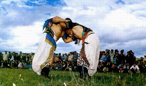 搏克比赛在悠扬激情的"乌日亚"赞歌声中开始,比赛场地无特殊要求,有一块平坦草地或土质地面即可举行。选手们挥舞着壮实的双臂,跳着模仿狮子、鹿、鹰等姿态的舞步入场。比赛规则简单明了,不限时间,参赛者也不分体重,膝盖以上任何部位着地为负。搏克运动要求选手腰、腿部动作协调配合,在对抗中充分显示自己的力量和技巧。 搏克的大众性体现在对待参加者的资格要求上,不分年龄,地位、民族、地域和运动经历,只要在额满之前报名都可下场参加比赛,而且规则面前,人人平等。 ![]()