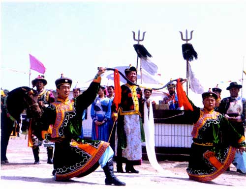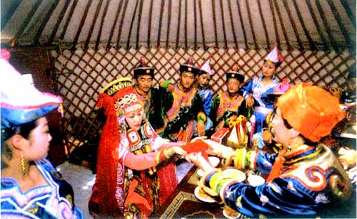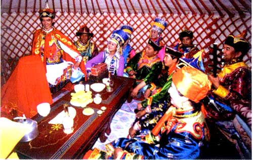 下午申时,新郎家中,宾客盈门,馈赠礼品。主家摆下宴席,请来乐手、歌手,宴请大宾、伴郎、祝颂为首的娶亲代表。宴罢,鼓号一响,已近日募。娶亲的人们来到禄马下面,祭过圣主成吉思汗。此时,披弓挂箭的新郎如一位即将出征的勇士被众人簇拥过来。据传,战时娶亲,必佩戴弓箭,一为随时备战,二怕“抢亲”的习俗。新郎翻身上马,充当司仪的祝颂人端起一碗鲜奶,高声吟诵《弓箭赞》《骏马赞》。念了三遍后,一行四人的娶亲队伍策马向新娘家驰去。 ![]()