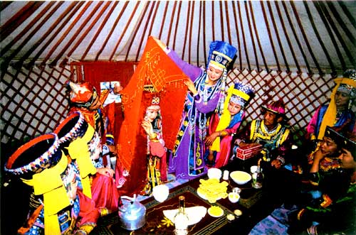 送亲上路 女方家最盛大的婚宴就要开始了。宴毕,新娘就要出嫁。所以也称“离娘宴”。同时也是新郎的最后一次过关考试。先轮流给宾客叩头敬酒,接受女方家亲戚赠送的衣服佩饰,穿上才可以娶走新娘。进膳时,新郎必须当众掰开一个半生不熟的羊脖子,一般羊脖子里总要塞根红柳棍,以考验新郎的腕力和智力。宴后,新娘就要登程,女友们把新娘团团围住,进行“阻嫁”,男方奋力抢亲。之后,开始装扮新娘。馆头额吉解开新娘的大辫,蘸着碗里的清水,梳得油光净亮,把链垂头饰戴上,意味着少女时代就此结束,今后将以少妇的形象出现。女方送亲的人准备好骑乘,在悠扬的礼赞声中,蒙着红纱的新娘由俩位胞兄牵着,缓缓穿过人群上了红马,向婆家走去。这时,女方宾客唱起了惜别的歌为她送行,直唱得新娘泪如雨下,不时地停马回望。 ![]()