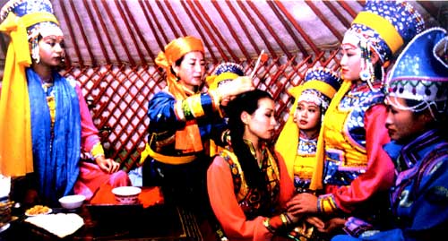鄂尔多斯婚礼一般要持续两天至三天,自始至终都洋溢着迷人的蒙古族风情。有哈达订亲、佩弓娶亲、拦门迎婿、献羊祝酒、求名问庚、卸羊脖子、分发出嫁、母亲祝福、抢帽子、圣火洗礼、跪拜公婆、掀开面纱、新娘敬茶,大小回门等一系列特定的仪式程序和活动内容。 ![]()