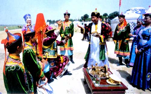 鄂尔多斯婚礼• 交接茶勺 这些仪式程序和活动内容既不同于其他民族婚礼的程序,也与其他地区的蒙古族婚礼有别,是蒙古族婚礼中最具特色、最有吸引力、最隆重的形式,它凝聚了蒙古民族礼仪风俗的精华,成为迄今保留最完整、内容最丰富的一部蒙古民族风情画卷。鄂尔多斯婚礼以男方娶亲为主线,浓缩了蒙古族娶亲过程中的精华内容,寓情于歌舞,场面热烈欢快、诙谐喜庆,内容健康,品格高雅,突出表现了蒙古族人民粗犷剽悍、豪爽热情、讲究礼仪的民族性格。鄂尔多斯婚礼集鄂尔多斯蒙古族传统的崇尚文化、祭祀文化、宫廷文化、饮食文化、服饰文化、礼仪习俗、民族歌舞之大成,以幸福、吉祥、喜庆、热烈的情绪贯穿始终,展示了民族魅力,表达了人们追求幸福生活的美好愿望,具有丰富而深刻的文化内涵。 |