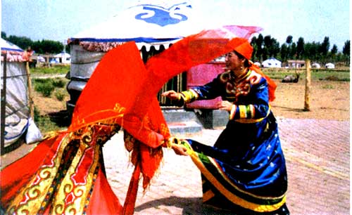 送亲上路 女方家最盛大的婚宴就要开始了。宴毕,新娘就要出嫁。所以也称“离娘宴”。同时也是新郎的最后一次过关考试。先轮流给宾客叩头敬酒,接受女方家亲戚赠送的衣服佩饰,穿上才可以娶走新娘。进膳时,新郎必须当众掰开一个半生不熟的羊脖子,一般羊脖子里总要塞根红柳棍,以考验新郎的腕力和智力。宴后,新娘就要登程,女友们把新娘团团围住,进行“阻嫁”,男方奋力抢亲。之后,开始装扮新娘。馆头额吉解开新娘的大辫,蘸着碗里的清水,梳得油光净亮,把链垂头饰戴上,意味着少女时代就此结束,今后将以少妇的形象出现。女方送亲的人准备好骑乘,在悠扬的礼赞声中,蒙着红纱的新娘由俩位胞兄牵着,缓缓穿过人群上了红马,向婆家走去。这时,女方宾客唱起了惜别的歌为她送行,直唱得新娘泪如雨下,不时地停马回望。