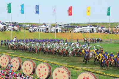 蒙古语意为“游戏”或“娱乐”。原指蒙古族传统的“男子三竞技”--摔跤、赛马和射箭。随着时代的发展,逐渐演变成今天的包括多种文化娱乐内容的盛大庆典活动和物资交流活动。历史上的那达慕不受时间限制,通常在祭祀山水、军队出征、凯旋、帝王登基、正月以及大型庆典等场合举行。今天的那达慕,每年在夏秋之交举行,一般是看当年牧业的生产情况,小丰收小开,大丰收大开。活动内容除了传统的“男子三竞技”,还有文艺演出、田径比赛和各类经济文化展览以及订货洽谈、物资交流等。 |