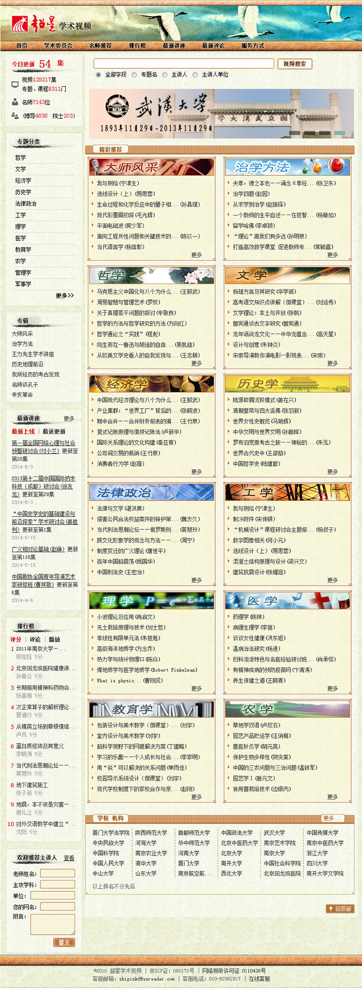 超星学术视频邀请国内外知名专家学者、学术权威,通过授权方式获得他们的支持,将其学术思想和多年研究成果系统地记录、保存并制作成超星学术视频。为学习者提供高水平、高质量的教育,引领学习者开阔视野、深度阅读、获取知识。
