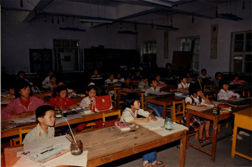 一九八九年暑假期间,绘画班的小朋友在认真听老师讲课