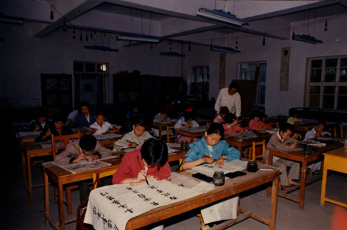 一九八九年暑假期间,在书画培训班上老师金大鹏在给学生作指导