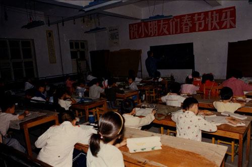 一九八九年暑假期间,在书画培训班上学生们用心听讲