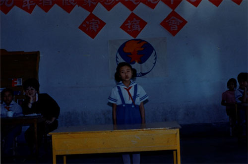 一九八九年八月十六日,实验小学的学生在演讲会上讲故事
