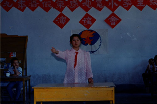 一九八九年八月十六日,小学生故事演讲会上五完小的学生在讲故事