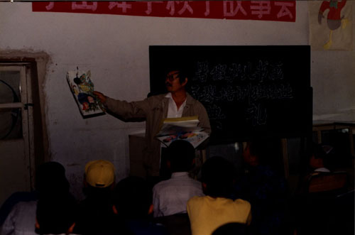 一九九〇年暑假,在结业典礼会上李老师讲解小班一等奖者作品