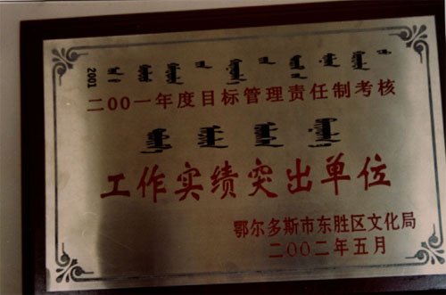 2002年5月东胜市少儿图书馆在2001年度目标管理责任制考核中获得“工作实绩突出单位”荣誉证书