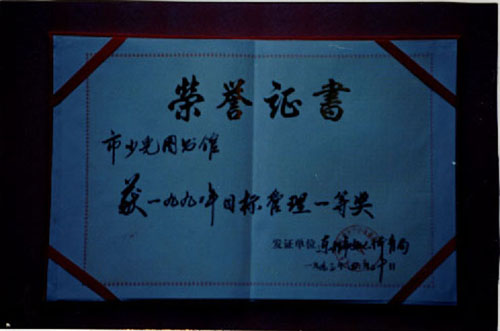 1993年4月文化工作会上,东胜市少儿图书馆获《一九九二年目标管理一等奖》荣誉证书