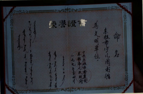 1995年4月东胜市委、市政府命名少儿图书馆为文明单位并获荣誉证书