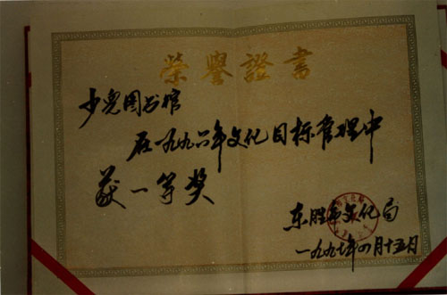 1997年4月市少儿图书馆获文化目标管理一等奖荣誉证书