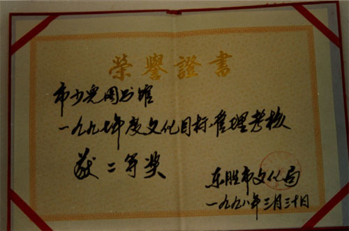 1998年3月市少儿图书馆获九七年度文化目标管理考核二等奖荣誉证书