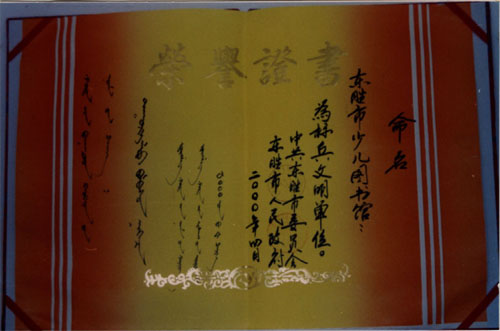 2000年4月东胜市委市政府任命东胜市少儿图书馆为标兵文明单位