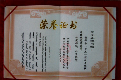 2006.7月东胜区委区政府颁发“十五”期间文化强区建设先进集体证书