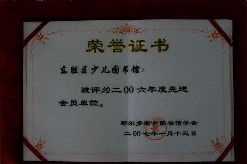 2007年2月少儿图书馆被评为2006年度图书馆学会先进会员单位