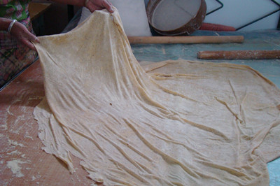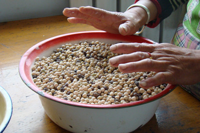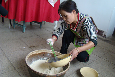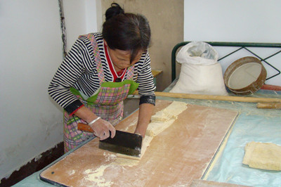 在过去,东胜区地区的汉人只有在逢年过节或招待贵客、举办重大吉庆活动时,把豆面和糕并列为上好的食品供大家食用。传统正宗的豆面是用豌豆制作的,在没有豌豆的情况下,用蚕豆也是可以的,但颜色和味道却大打折扣了。 豆面的制作过程:一、“拉豌豆”即将豌豆在石磨上去皮使豌豆成豆瓣;二、粉豌豆,将豌豆豆瓣用适量的温水拌湿,让水分慢慢渗透,使豆瓣变软,这个软硬的程度是有讲究的,软到用手摸感到潮湿,用牙咬不费劲没有声音为好;三、磨面,把粉好的豌豆豆瓣用石头碾子压成面粉就可以用来做豆面了;四、和面,取豌豆面两三斤加入适量的蒿籽拌匀,放入蒿籽的多少是一种手艺是有讲究的,蒿籽少了粘度不够,制作出来的面条不精到,煮的时候会溶化掉,蒿籽多了韧性太大,难以擀成面条,口感僵硬且不好消化。五、嚼(读去声)面,把拌匀的豌豆面和成软硬适度的面团,醮着水反复揉搓,使其变的精到,和好后再分成碗口大小的若干块,用潮湿的笼布盖好以防面团表面干燥;六、擀面,取一块用擀面杖擀成薄薄的面皮,折叠后切成细细的面条,收拢成团,整个过程就算完成了。 豆面的吃法只有一种,就是将煮熟的面条加入调汤即可,调汤方言叫做臊子,臊子最好用猪肉丁土豆或豆腐丁熬制,放入红葱末,味道独特香美。随着东胜经济的快速发展和城市化进程的不断加快,农村大多数居民迁移到城市居住生活,因而传统擀豆面手工制作技艺面临失传的局面,为此我们将擀豆面传统手工制作技艺列入非物质文化遗产保护名录加以保护与传承。