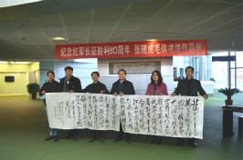 为“纪念红军长征胜利80周年”,同时纪念毛泽东同志诞辰123周年,中国毛体书法家协会会员张随成先生亲临东胜区图书馆,他多年来潜心研摹“毛体”书法艺术,造诣颇深,在开展现场泼墨挥毫即兴创作书法作品,为广大读者带来一场视觉盛宴。此次展出作品有80多幅,展览为期2周,开展时间为12月10日到12月24日。 走进展厅,首先映入眼前的是三幅苍劲有力的毛体书法,体式雍容大度,章法纵横驰骋,笔墨潇洒淋漓,浑然天成。随后在馆领导带领下一行人参观毛体书法作品,参展作品形式丰富,内涵深刻,饱含正能量,吸引了各地百余名书画爱好者前来观赏,大家在水墨丹青间重温了长征历程,感受了长征精神,细细品味出了长征精神所蕴含的时代意义,受到社会各界人士的一致好评,纷纷表示上了一堂丰富的红色教育课。 这次张随成先生的书法在我馆展出,给我们提供了一次难得的学习机会,给我市书法家和爱好者提供了一个艺术交流的平台,为我市以后的书艺交流打下良好的基础。希望通过这次书法展,能够重温党的光辉历史,铭记党的光荣传统。