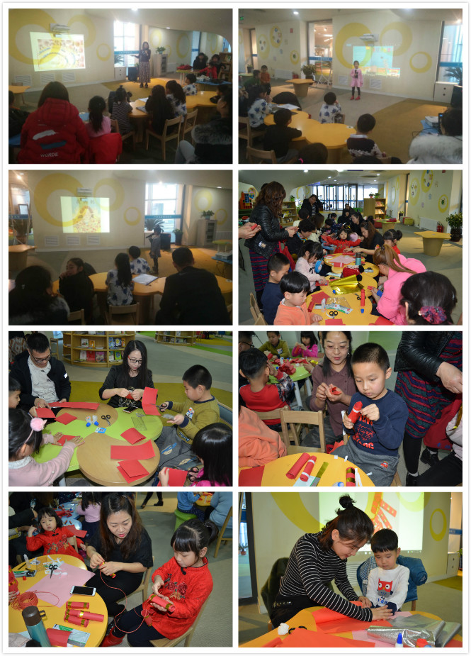 本周日上午,棉花糖姐姐和小读者们共读绘本《十二生肖》,小朋友们知道自己属什么吗?有属小白兔的,有属大老虎的……那有属猫的吗?没有,怎么有属老鼠的,没有属猫的呢?这里有个故事。 很久很久以前,有一天…… 孩子可能在很小的时候就被告知自己属什么属相,或许也能熟练地背出十二生肖,但是有几个小朋友知道这十二位生肖到底是怎么来的呢?这本书将生肖的传说用可爱的画风呈现给大家。 爆竹声中一岁除,春风送暖入屠苏。在新年的开头又怎能少了红红火火的鞭炮呢?下午,棉花糖姐姐带领小朋友们一起制作亲子手工“小鞭炮”。 活动开始,工作人员将制作材料一一发放给家长和小朋友们。大家利用卡纸、红绳巧手制作“绿色鞭炮”,你卷炮筒,我粘贴,忙的不可开交。制作之余,工作人员还和小朋友们分享了他们小时候的过年趣事,现场气氛一片欢腾。 不一会儿,串串鞭炮便制作而成,为即将到来的新年增添了更多的年味儿,小朋友的动手能力也更强啦!