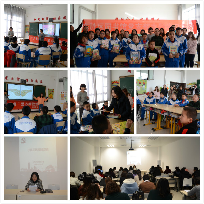 自选动作——主题党日+志愿服务活动:为进一步弘扬中华民族扶幼助残的传统美德,树立党员先锋模范带头作用,共同营造关爱特殊人群的社会风尚,东胜区图书馆党支部党员干部走进特殊学校开展11月主题党日活动暨志愿服务活动。本次活动以“为你读书”爱心朗读为主题,首次将图书馆儿童阅读推广品牌——“棉花糖姐姐讲故事”活动延伸至馆外,来到小读者的身边,由图书馆员现场与小朋友们分享演绎经典绘本故事,新颖活动形式受到小朋友的一致欢迎,大家好奇的围坐在“棉花糖姐姐”周围,共同体会温馨感人的绘本故事。此外,图书馆党员们还为小朋友们送来了40册精美绘本及拼音读物,全部由全体党员自发购买书籍捐赠,