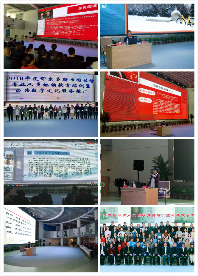 2018年11月29日—12月1日,为期3天的2018年鄂尔多斯市图书馆专业技术人员继续教育培训班在东胜区图书馆圆满结课。 本次培训邀请北京大学信息管理系党委书记、教育部图书馆学专业教学指导委员会秘书长、中国图书馆学会学术研究委员会图书馆学理论研究委员会副主任张久珍教授、鄂托克旗图书馆馆长刘亚涛、鄂尔多斯市图书馆采编部主任王惠、鄂尔多斯市图书馆古籍部馆员乔纪娟,对来自全市各旗区公共图书馆及部分企事业单位、院校、镇(街道)、村(社区)等图书馆(室)的280名学员围绕“图书馆在新时代新环境下的阅读推广和创新服务”主题进行了集中培训。培训内容包括《新媒体环境下图书馆宣传推广创新模式的构建》、《少儿阅读推广工作》《以活动推广全民阅读,塑造读者服务品牌--以鄂尔多斯市图书馆为例》等,其中,张久珍教授以“公共图书馆创新服务的趋势”为题,结合国内外实例围绕公共图书馆服务理念创新、空间再造、实务边界的可突破性、有效开发读者代际服务4个方面为学员进行了业界发展趋势和前沿知识的讲解,具有极强的指导意义和实操性。集中授课完毕后,全体学员进行了闭卷考试并对成绩合格者颁发结业证书。 通过集中授课及各馆间相互交流,让学员们在创新服务、宣传推广、阅读发展方面进一步夯实了专业基础,加强了职业责任意识,为加快业界专业技术人员知识更新速度、适应新时期图书馆事业发展需要提供了知识保障。