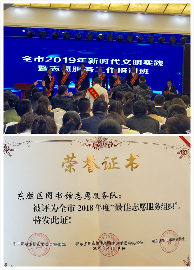 4月15日上午,全市2019年新时代文明实践暨志愿服务工作培训班在东胜区召开。会上,东胜区图书馆志愿服务队荣获全市2018年度“最佳志愿服务组织”奖。 东胜区图书馆志愿服务队成立于2010年12月,现有注册志愿者76人,陆续组建阅读指导服务队、图书业务辅导服务队、文明阅读劝导服务队及创客体验服务队4支志愿服务队伍。各志愿服务队积极发挥自身专业优势,围绕“场场有亮点 人人可参与”的原则,整合各类文化资源,因地制宜展开志愿服务。定期开展“棉花糖姐姐讲故事”低幼亲子阅读指导、“萌娃爱上图书馆”亲子手工制作及创客体验、基层图书辅导等丰富多彩的志愿服务活动,积极倡导阅读新风尚,营造浓厚书香氛围,让基层百姓共享公共文化服务创建成果,推进志愿服务制度化常态化。 今后,东胜区图书馆将再接再厉,充分发挥先进典型的示范带动作用,继续弘扬志愿精神,积极培育和践行社会主义核心价值观,弘扬中华优秀传统文化,深化全民阅读工作,巩固“书香城市”建设成果,确保东胜区图书馆“新时代文明实践站”的各项工作取得实效,更好地服务人民。