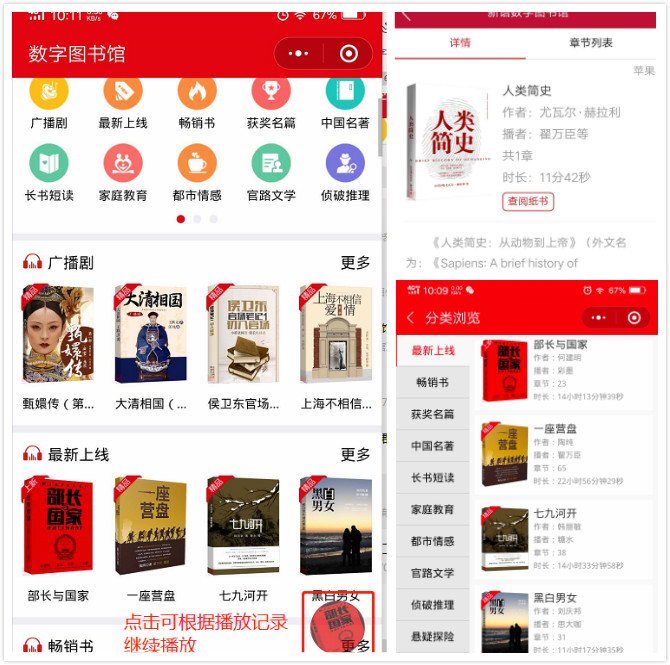 “新语数字图书馆”是国内以经典出版物为主要内容来源的有声书数字出版与阅读平台,是一个专门听书的数字图书馆平台。近日,东胜区图书馆对该平台作了进一步升级,可以在不影响手机其他工作的情况下进行,也可以根据之前的听书记录继续播放,为读者带来了更多的方便。 新语数字图书馆是累计收录有声书18万余集,合计5万小时,包含张炜、胡学文、梁晓声、葛亮、刘猛、周浩晖、周大新、陈忠实、高满堂、麦家、海岩、孙皓晖、毕飞宇、尹建莉等大批知名作家文学作品,由名家名嘴原声演播,配以精品音效制作,给读者带来知识与听觉的双重享受。 内容共30大类:主要包括广播剧、获奖名篇、畅销书、最新上线、中国名著、外国名著、官场小说、家庭教育、都市情感、侦破推理、历史文学、军事文学、职场小说、少年文学、世界童话、科幻世界、科普百科、小牛顿科普、国学经典、名人传记、心灵鸡汤、长书短读、商学院、诗歌散文、惊悚悬疑、外国名著、养生堂、人文地理、传统文化等等。 此外,如果您听着觉的这本书还不错,想看纸质图书,可以点击查阅纸书,就能查到图书馆是否有这本书,并到图书馆进行借阅。 访问方式:东胜区图书馆微信公众号——资源推荐——新语数字图书馆(即可访问) 读者可通过各个应用商店均可搜索“新语数字图书馆”并下载可直接访问。