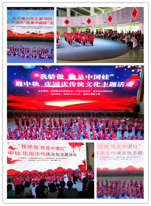 在中秋国庆双节来临之际,为了培养少年儿童热爱党、热爱祖国、热爱家乡的崇高理想,引导他们用社会主义核心价值观引领人生航向,为实现中国梦而努力学习、奋发向上,9月26日,由共青团鄂尔多斯市委员会、共青团东胜区委员会、东胜区图书馆、蓝天社会帮扶中心主办、麦之声少儿口才、金牌主播星工场承办的“蓝天青少年之家”迎中秋 庆国庆“我是中国娃”主题活动在东胜区图书馆举办,此次主题活动共有300多人参与。 通过本次活动的开展,让孩子们收获了良好的爱国主义教育,感受到祖国的繁荣富强。“我骄傲,我是中国娃”迎中秋庆国庆活动圆满落幕!