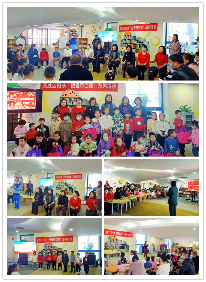 为了深入贯彻落实习近平总书记关于儿童和儿童工作的重要论述,使广大少年儿童度过一个健康、安全、温暖、幸福、充满爱的童年,2月25日下午,由鄂尔多斯市东胜区妇女联合会主办,东胜区图书馆、爱自然生命力内蒙古中心承办的“把爱带回家”儿童关爱服务活动在东胜区图书馆少儿阅读体验馆举办,活动向广大儿童和家庭送去温暖和关爱,进一步铸牢中华民族共同体意识。 活动中,家长和孩子们共同进行了游戏互动,并倾听了棉花糖姐姐带来的家风绘本故事,孩子们活泼可爱、家长们专注投入,通过家风故事让大家体会到了亲子阅读的快乐,大家纷纷表示:要多举办类似的活动,使更多家庭能够分享家风故事,分享家庭教育知识,让社会主义核心价值观在儿童心中落地生根。活动现场,还为孩子们发放了“爱心书包”,巾帼志愿者们为大家详细介绍了反家庭暴力、男女平等、家庭教育等相关知识并发放了各类宣传品共200余份。
