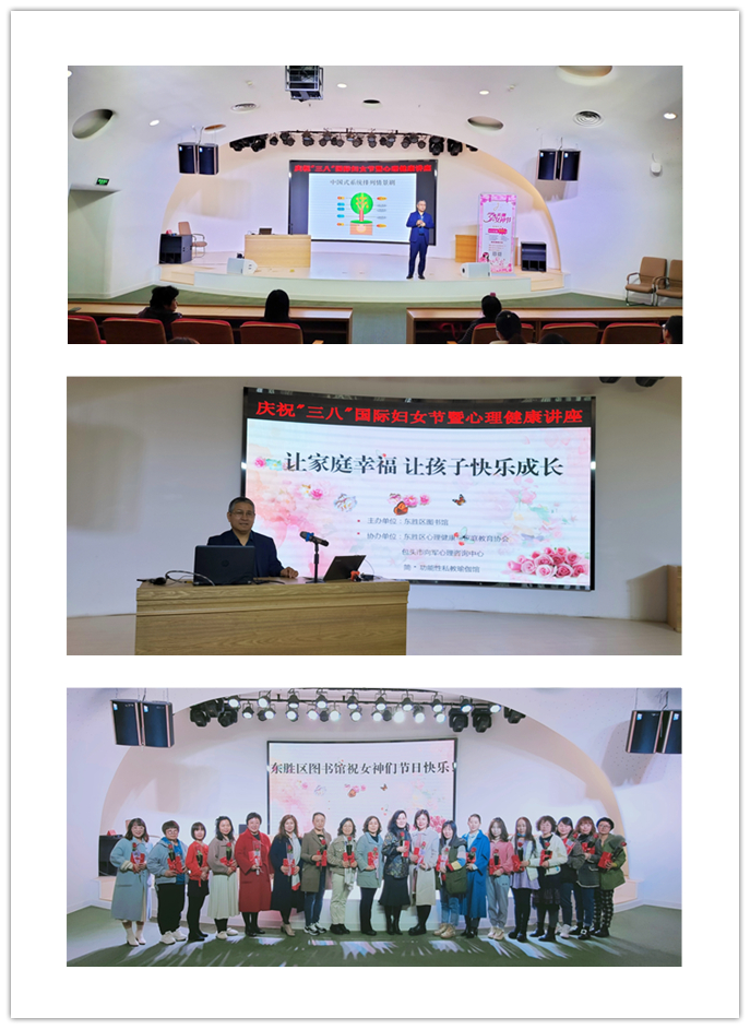 为使全体女性职工和读者度过一个和谐温馨、轻松快乐的“三八”妇女节,发扬“团结拼搏、开拓进取、与时俱进、无私奉献”的精神,丰富业余生活,缓解紧张繁忙的工作压力,东胜区图书馆于3月8日上午举办庆祝“三八”国际妇女节心理健康讲座--让家庭幸福让孩子快乐成长。 讲座特邀中国科学院心理研究所儿童发展与教育心理学专业毕业、全国青少年心理创新创业推荐榜“年度推荐人物”心理学专家李向军,从如何说孩子才会听、怎么听孩子才肯说以及现场情景模拟等多方面进行了精彩讲解。 通过讲座活动,既增长了知识,有益于女性的身心健康,又提高了馆员们的工作热情和积极性。 同时,东胜区图书馆党支部给全体女性职工赠送《民法典》书籍和玫瑰花,使女性职工在工作之余充分感受到了节日带给他们的喜悦和快乐! 东胜区图书馆党支部向妇女同胞致以节日的祝福和亲切的问候,向广大妇女工作者表示崇高的敬意!