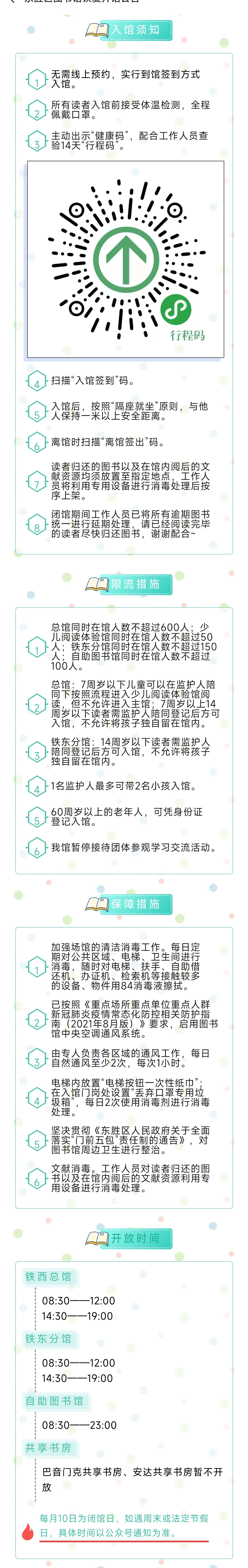 设为首页 | 加入收藏 | 联系方式 | 英文版 | 蒙文版 开馆时间:铁西总馆、铁东分馆:周一至周日8:30-12:00,14:30-19:00;自助图书馆:8:30-23:00