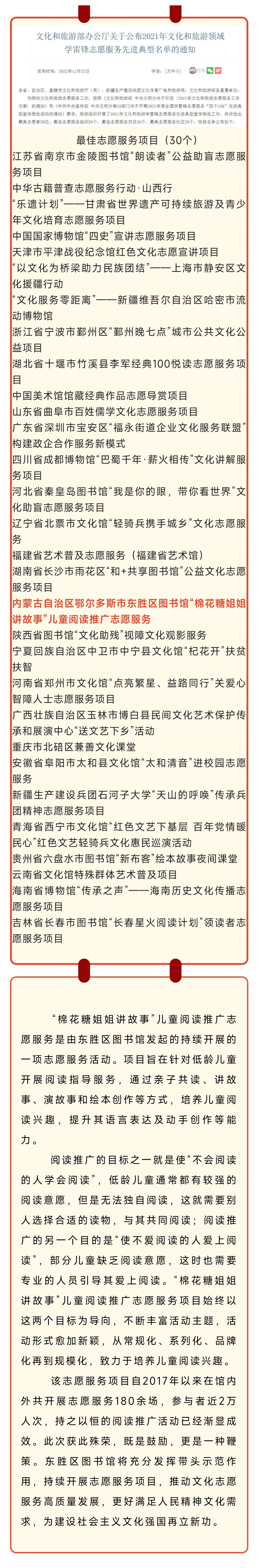 11月22日,文化和旅游部办公厅公布了2021年文化和旅游领域学雷锋志愿服务先进典型名单,东胜区图书馆“棉花糖姐姐讲故事”儿童阅读推广志愿服务入选最佳志愿服务项目,位列全国30个最佳志愿服务项目之一,是内蒙古自治区唯一入选该项目的单位。