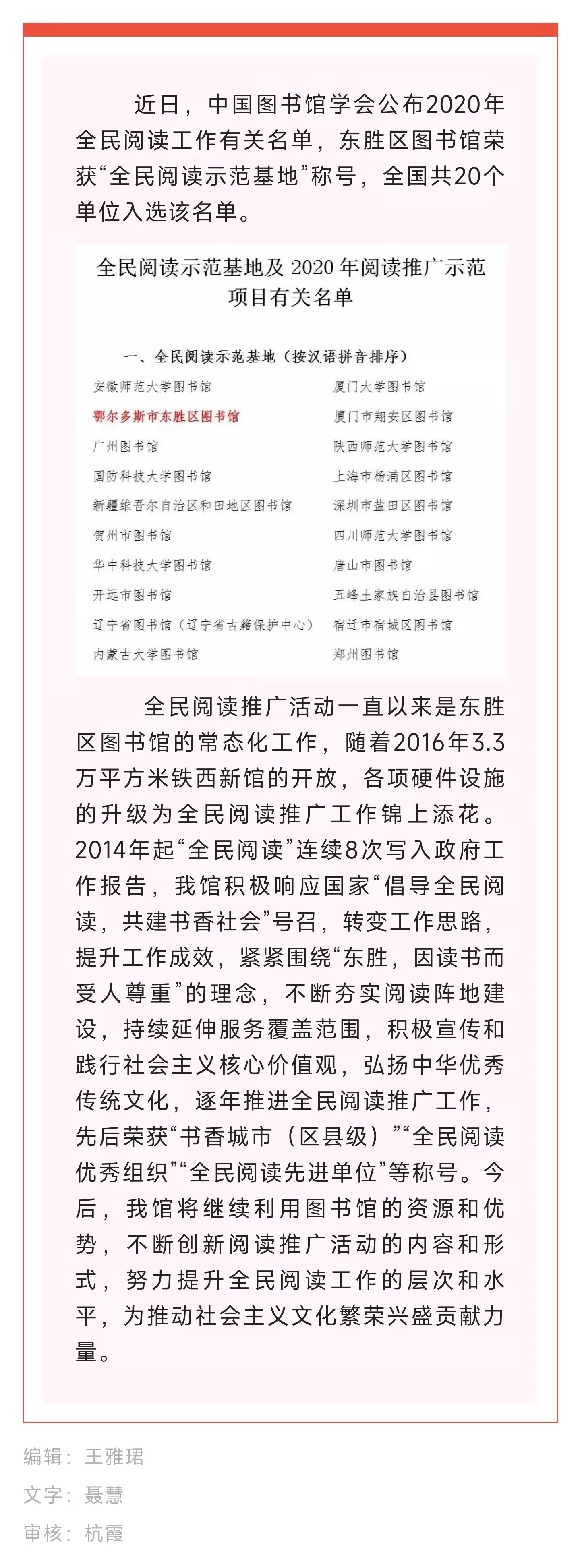 东胜区图书馆获“全民阅读示范基地”称号