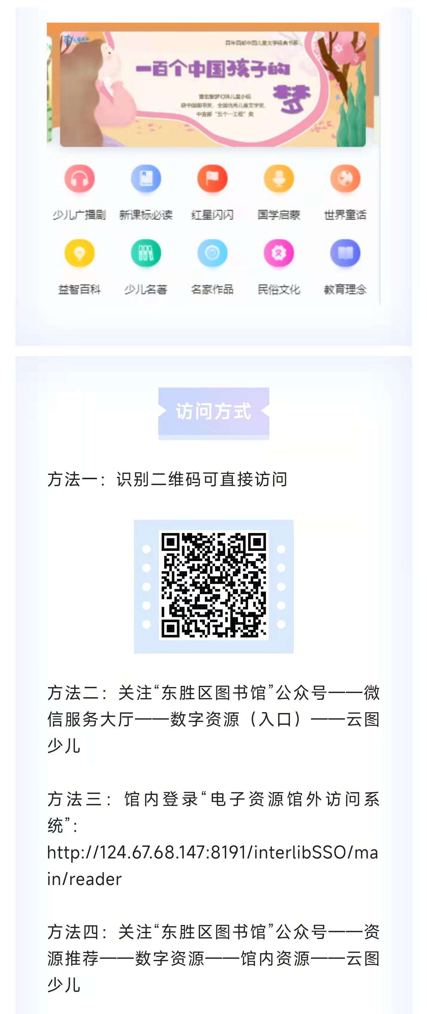 云图少儿数字有声图书馆是东胜区2019年引进的少儿有声资源库。所有有声资源都是真人原声录制,名家名嘴播讲,音乐音效生动细腻,现场感足,读者收听过程中既可汲取文化科学知识,又可体验语言艺术之美。 该资源库累计出版有声读物2万余集,合计1.5万小时,月更新可达600小时,内容主要包括国学启蒙、世界童话、儿歌故事、中外名著、名人传记、历史故事、少儿科普、军事战争、中国文化八大分类。根据读者年龄阶段和语言学习能力差别,按0-6岁、7-12岁、13-18岁、家长必读、中小学课外阅读等专题,使读者快速、准确地找到自己所需的有声内容。